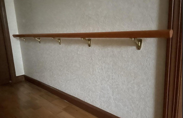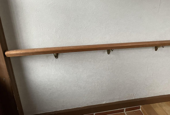 まずは、オーク材無垢で仕上げた高級手すり。壁側に取り付ける仕様で、堅牢さと天然木ならではの温かみを兼ね備えた価値ある逸品です。既製品にはない無垢材の存在感は、空間を格上げする上質なアクセントとなります。